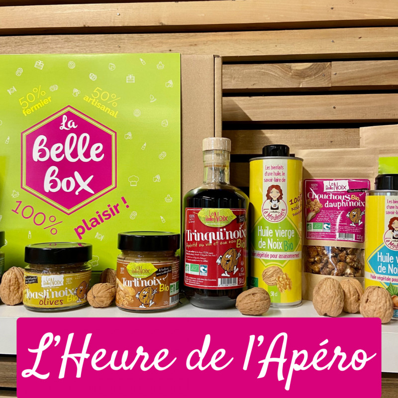 Dans ce coffret se trouvent réunis tous les ingrédients d'un apéritif gourmand et réussi : depuis les cerneaux enrobés d'épices jusqu'au célèbre vin de noix typique du Dauphiné, en passant par la farine de noix pour préparer vous-mêmes vos crakers ou autres recettes. Il ne vous reste plus qu'à trouver les personnes avec qui trinquer et passer un excellent moment !